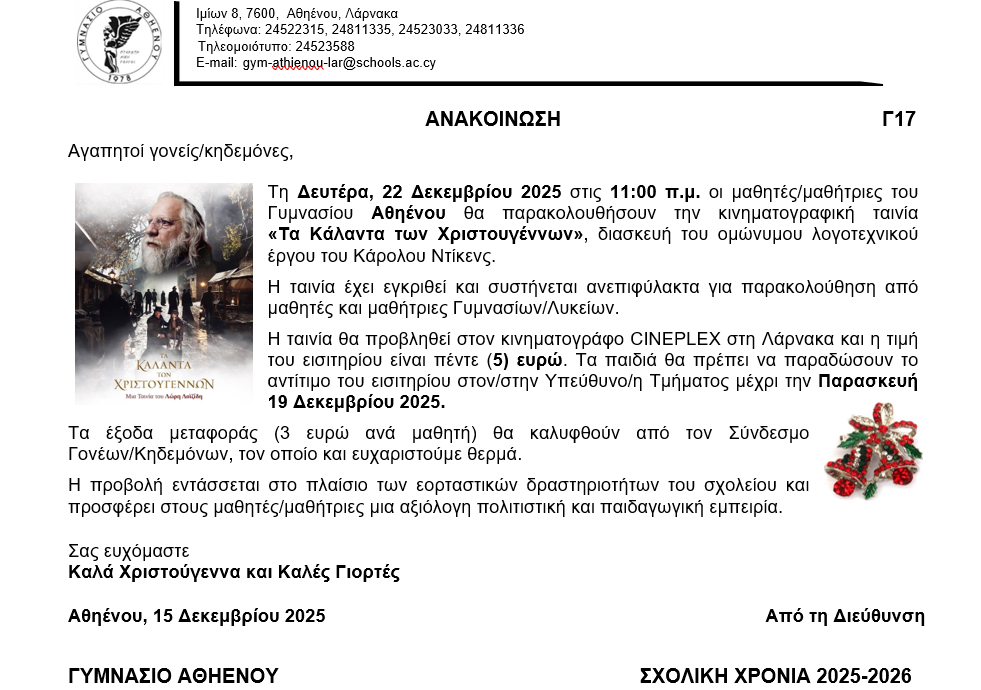 - Παρακολούθηση της κινηματογραφικής ταινίας "Τα κάλαντα των Χριστουγέννων" από τους μαθητές του σχολείου μας - 22/12/2025