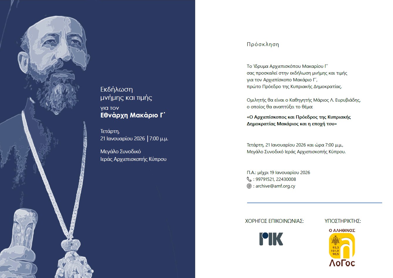 - Πρόσκληση για Εκδήλωση μνήμης και τιμής για τον Εθνάρχη Μακάριο Γ'