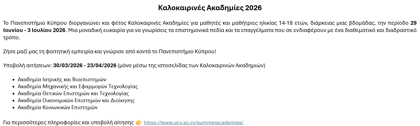 - Καλοκαιρινές Ακαδημίες για μαθητές και μαθήτριες ηλικίας 14-18 ετών
