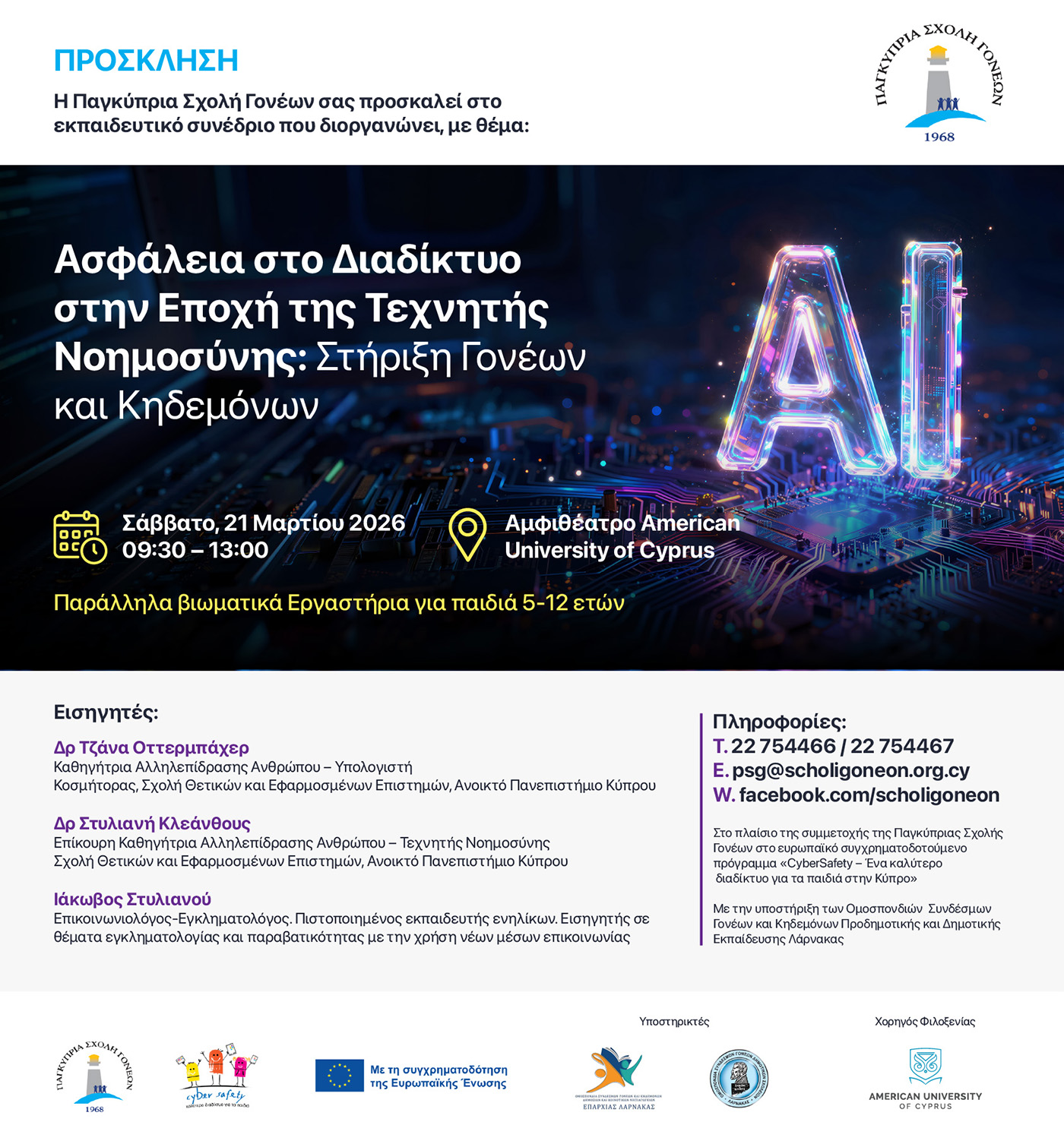 - Συνέδριο με θέμα "Ασφάλεια στο Διαδίκτυο στην Εποχή της Τεχνητής Νοημοσύνης: Στήριξη Γονέων και Κηδεμόνων". - Πρόσκληση 21/3/2026